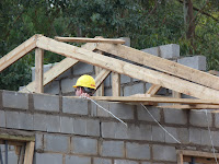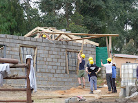 The trusses needed more reinforcement after which they were hoisted up one by one and fitted on the walls. This was a team effort as these structures are heavy and must be lifted quite high. Then the distance between them, as well as the alignment, had to be carefully measured before they could be fixed to the walls. Within a three hour spell, the house had a skeletal roof and the picture that we have all carried in our minds of the house, emerged as the day progressed.